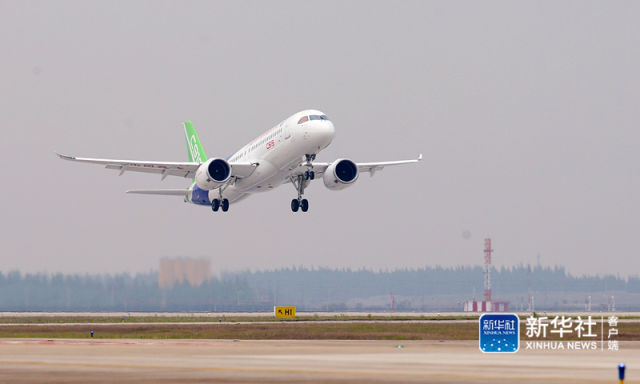 中国首款国际主流水准的干线客机C919在上海浦东国际机场起飞(2017年5月5日摄)。新华社记者 丁汀 摄