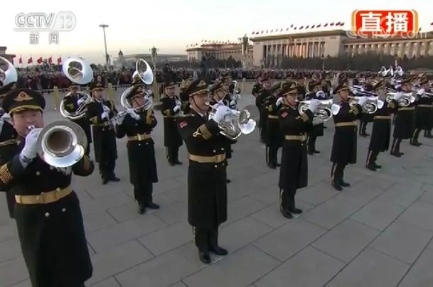 2018年元旦升国旗仪式最大亮点,就是有八名礼号手登上吹奏台吹响号角,嘹亮的号声将划破夜空,迎来2018年的第一缕曙光。
