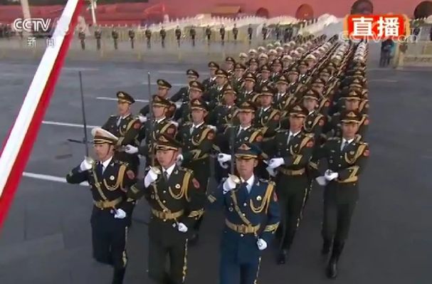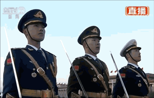 走在国旗手与护旗队中间的分队长,此次从一名增加到了三名,他们分别身着陆海空军礼服,配挂指挥刀,代表解放军全军,负责发出升国旗口令。