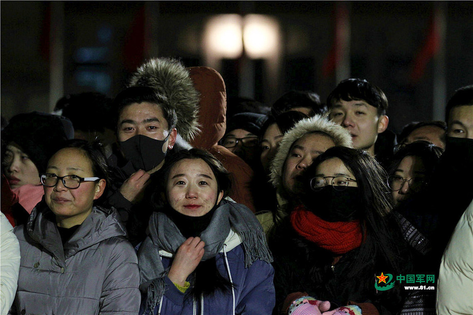 2018年1月1日清晨,北京天安门广场举行隆重的升国旗仪式,这是由人民解放军担负国旗护卫任务后,首次举行的升旗仪式。这是现场等待观看升旗仪式的观众。中国军网记者孙智英 摄