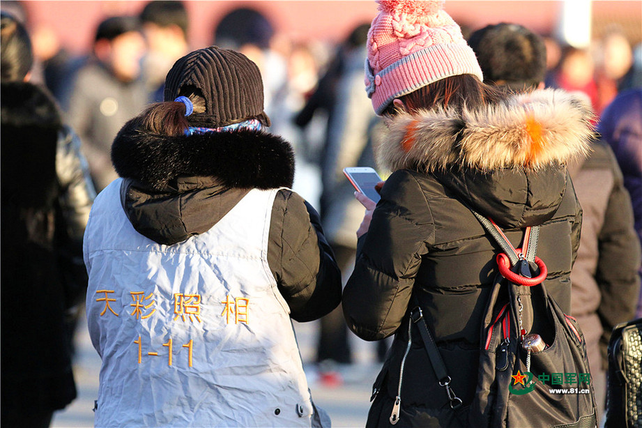 2018年1月1日清晨,北京天安门广场举行隆重的升国旗仪式,这是由人民解放军担负国旗护卫任务后,首次举行的升旗仪式。这是升旗仪式结束后观众留影纪念。中国军网记者孙智英 摄