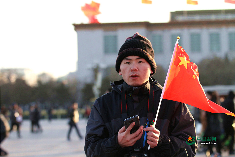 2018年1月1日清晨,北京天安门广场举行隆重的升国旗仪式,这是由人民解放军担负国旗护卫任务后,首次举行的升旗仪式。这是升旗仪式结束后观众留影纪念。中国军网记者孙智英 摄