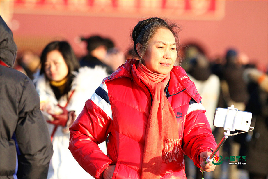 2018年1月1日清晨,北京天安门广场举行隆重的升国旗仪式,这是由人民解放军担负国旗护卫任务后,首次举行的升旗仪式。这是升旗仪式结束后观众留影纪念。中国军网记者孙智英 摄