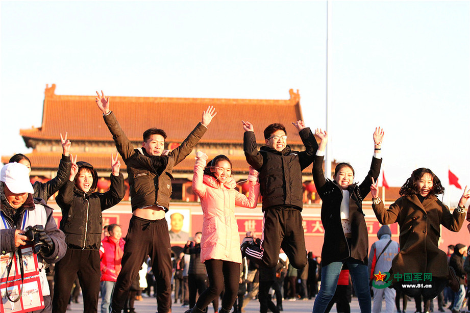 2018年1月1日清晨,北京天安门广场举行隆重的升国旗仪式,这是由人民解放军担负国旗护卫任务后,首次举行的升旗仪式。这是升旗仪式结束后观众留影纪念。中国军网记者孙智英 摄
