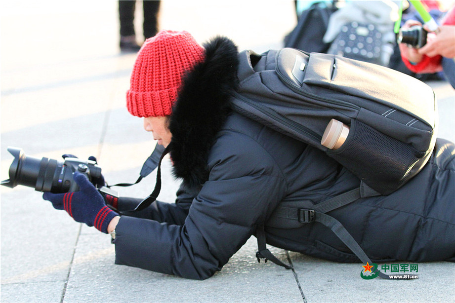 2018年1月1日清晨,北京天安门广场举行隆重的升国旗仪式,这是由人民解放军担负国旗护卫任务后,首次举行的升旗仪式。这是升旗仪式结束后观众留影纪念。中国军网记者孙智英 摄