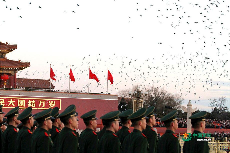 2018年1月1日清晨,北京天安门广场举行隆重的升国旗仪式,这是由人民解放军担负国旗护卫任务后,首次举行的升旗仪式。这是放飞和平鸽。中国军网记者孙智英 摄