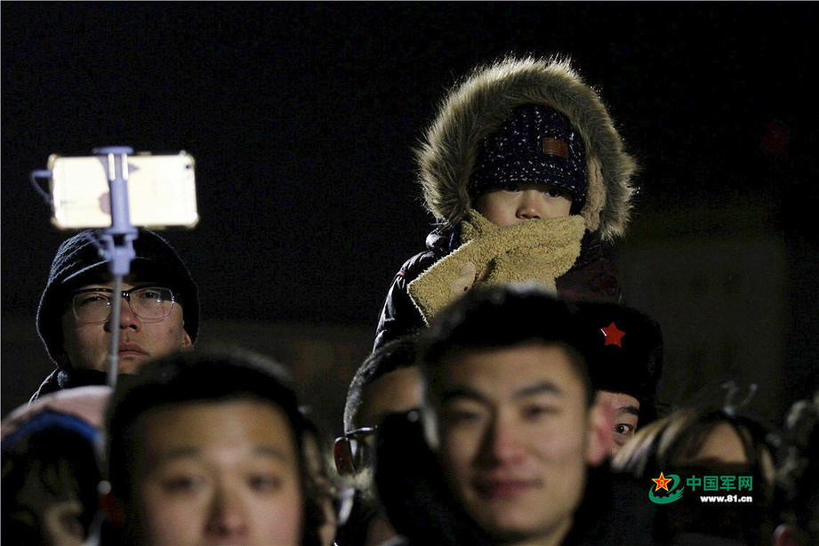 2018年1月1日清晨,北京天安门广场举行隆重的升国旗仪式,这是由人民解放军担负国旗护卫任务后,首次举行的升旗仪式。这是现场等待观看升旗仪式的观众。中国军网记者孙智英 摄