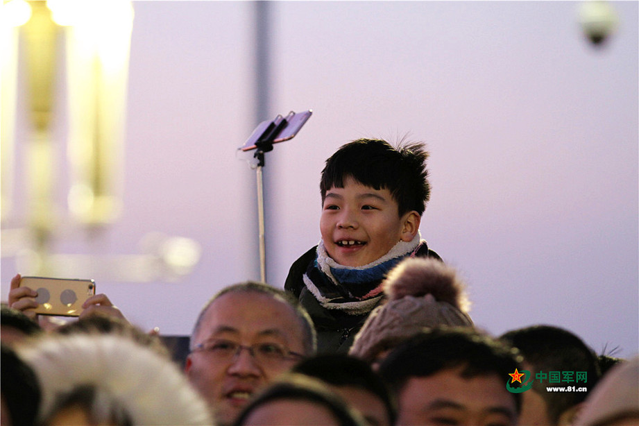 2018年1月1日清晨,北京天安门广场举行隆重的升国旗仪式,这是由人民解放军担负国旗护卫任务后,首次举行的升旗仪式。这是现场等待观看升旗仪式的观众。中国军网记者孙智英 摄