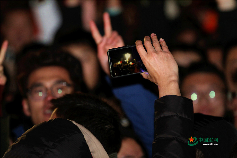 2018年1月1日清晨,北京天安门广场举行隆重的升国旗仪式,这是由人民解放军担负国旗护卫任务后,首次举行的升旗仪式。这是现场等待观看升旗仪式的观众举起手机拍摄。中国军网记者孙智英 摄