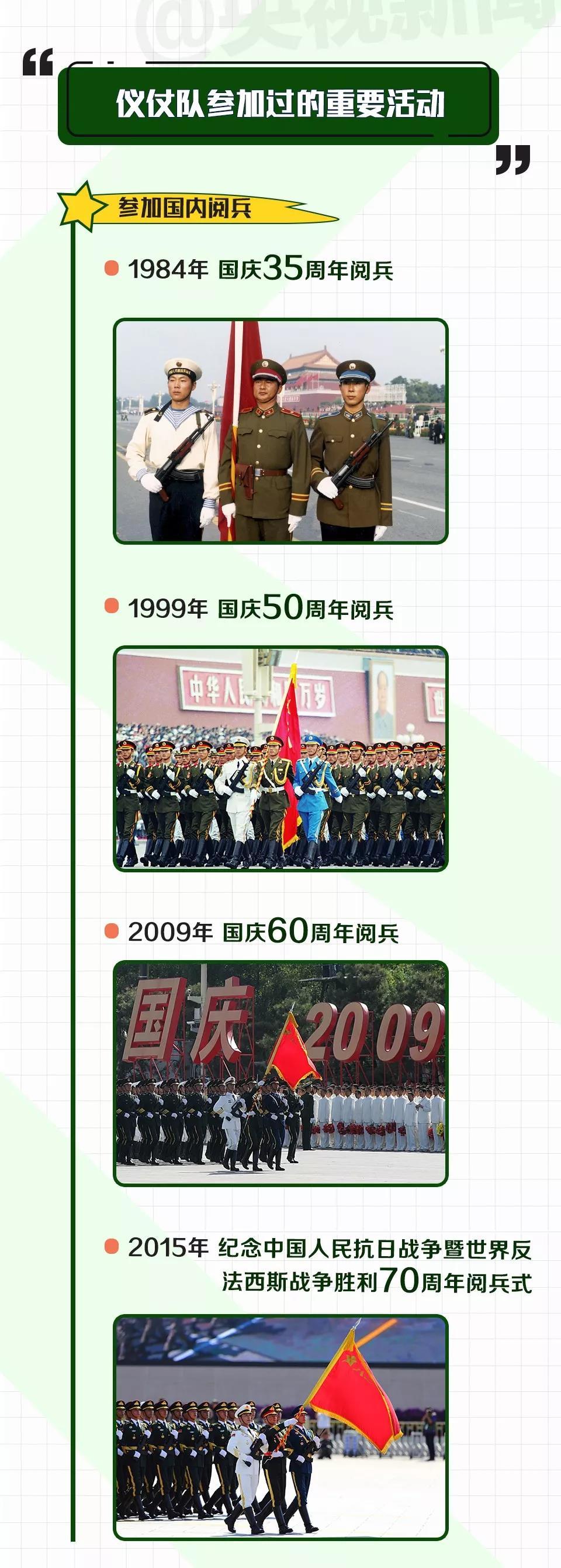 自1952年成立以来,解放军仪仗队多次负责担负迎送外国国家元首、政府首脑等活动的仪仗司礼任务。香港回归、澳门回归、北京奥运会开幕式等重要场合,他们都执行过升国旗的任务。在很多人看来,解放军仪仗队的战士们总是步伐铿锵、意气风发,其实在这背后,也有着不为人知的辛苦:他们每人每年平均穿破7双靴子,所有人的脚上都有磨破的伤痕;为训练表情眼神,他们夏天对着太阳练,冬天迎着寒风练,45秒钟不眨眼;很多仪仗队员走过的正步,距离累积起来相当于几个长征的里程……