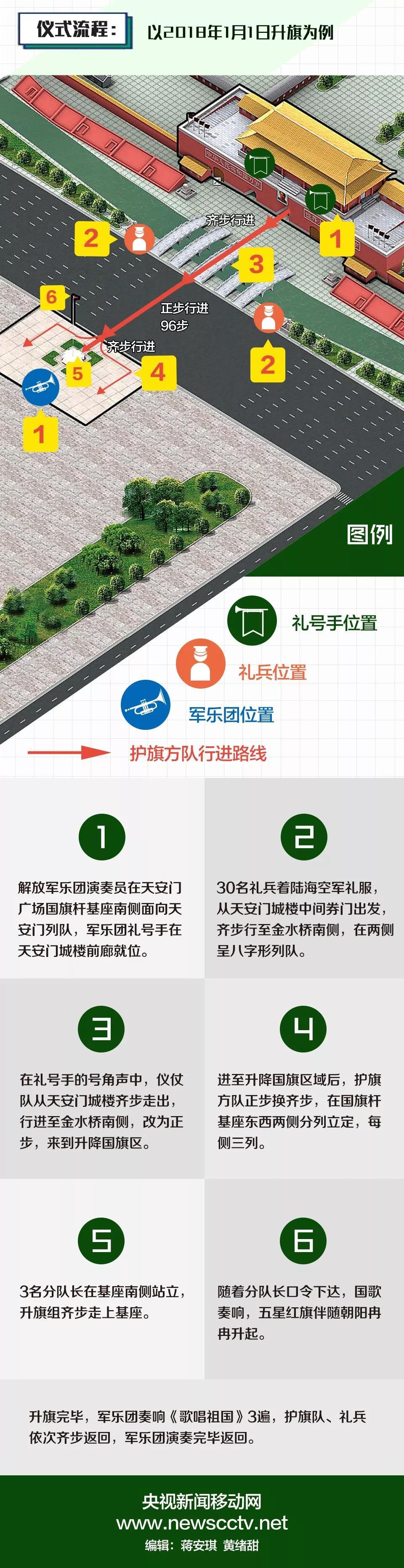 8名礼号手在天安门城楼吹响升旗号角后,解放军仪仗队96名护旗队员护送着五星红旗走过金水桥,踏入天安门广场。随着分队长发出升国旗口令,雄壮的国歌声响彻广场,鲜艳的五星红旗与太阳一同升起。有网友表示:“每次看到这庄严的场面,心里都久久不能平静,那是一种敬畏、神圣的感觉。”