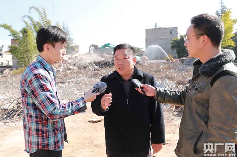 中央人民广播电台赴云南走转改采访团记者肖源、李健飞采访当地拆迁工作负责人 央广网李雪南 彭兆伟 摄