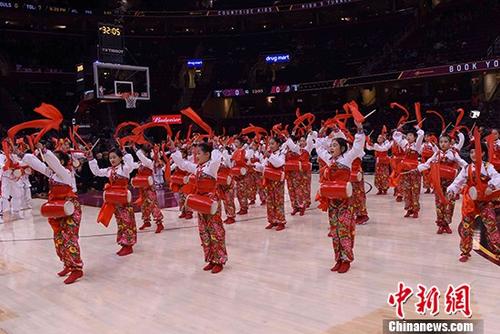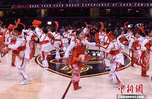 当地时间1月2日晚,位于美国俄亥俄州的克利夫兰骑士队主场迎来一群特殊的客人。来自中国甘肃省兰州市的近百名小学生在骑士队主场速贷球馆擂响安塞腰鼓,为现场观众送上新年祝福。中新社记者 刁海洋 摄