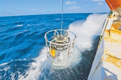 工作人员正在下放温盐深仪,用于探测海水温度、盐度和深度。资料图片