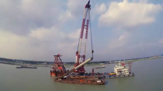 工程师沈涛和他的同事,要把一根世界上最长、最重的钢桩打入帕德玛河床中。