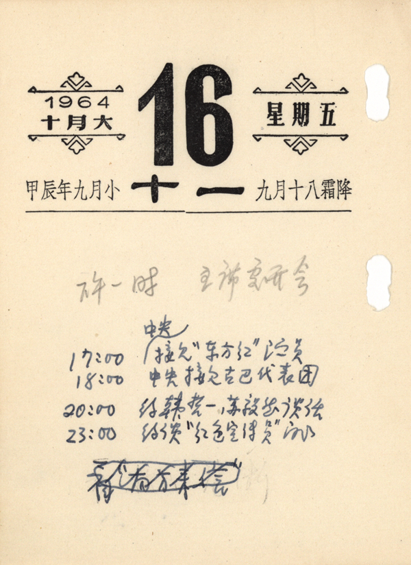 1964年10月16日,周总理工作台历上密密麻麻的安排一直持续到晚上11点。正是这一天,在人民大会堂,周总理庄严宣告:“我们国家第一颗原子弹爆炸成功了!”