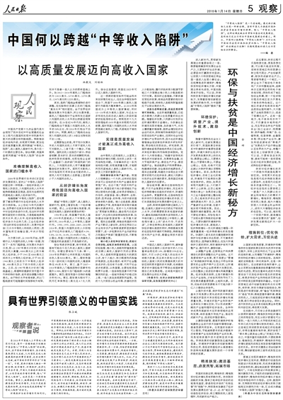 “中等收入陷阱”是一个老话题。最近西方媒体又出现一种新论调,宣称中国大力推进环保和扶贫会导致经济增长停滞,陷入“中等收入陷阱”。这种论调反映出非常陈旧落后的发展理念,表明他们完全不明白中国新发展理念的意义。那么,中国何以能跨越“中等收入陷阱”?为什么说中国经济会因环保和扶贫而陷入“中等收入陷阱”的论调站不住脚?本期观察版约请几位专家给出分析解答。