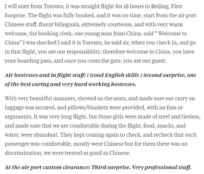 一切故事要从Sam Arora在多伦多踏上中国国际航空公司的飞机开始说起。外语流利的工作人员、礼貌、充满热情的欢迎及周到的服务让他“倍感舒适”。他还讲述了他的妻子耳环遗落在酒店一事。因为耳环并不贵重,所以他也没有试图寻找。但酒店人员却在他们离开之后主动联系他们,并归还了耳环,即使它并不昂贵。他写道:“我们再次无言以对, (因为)我非常肯定他们邮寄耳环的费用和他们的努力远远超过耳环本身的价格。但关于此事的记忆赢得了我们的心,并将永远伴随着我们。 ”