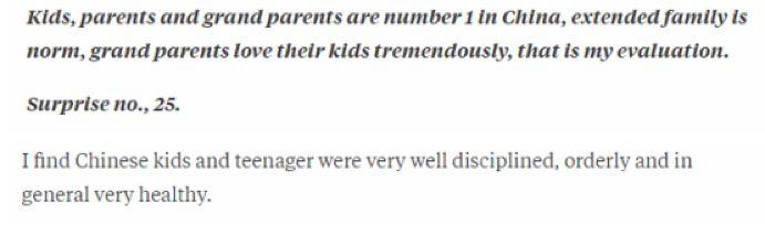 Sam Arora还写道:“孩子、父母和祖父母都是中国的Number 1。在中国,大家庭是常态,祖父母们也非常爱孩子。 ”他还说:“中国的儿童和青少年纪律很好、有条不紊,都很健康。”
