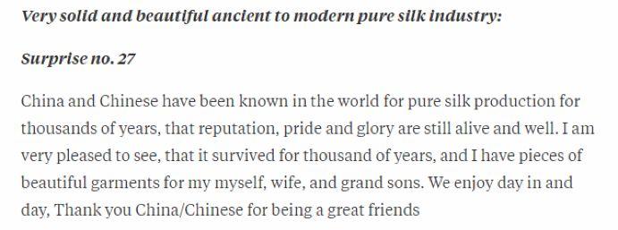中国和中国人数千年的丝绸制造工业享誉世界,“这种名誉、骄傲和荣耀至今仍存”。Sam Arora说:“我很高兴,他们延续了数千年。”他还为自己及家人准备了一些漂亮的衣服。他说:“我们很享受每一天,感谢中国和中国人这如此优秀的朋友。”