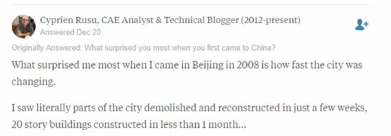 法国网友Cyprien Rusu对“中国基建速度”夸赞了一番。他说:“让我感到最意外的地方是这个城市变化的速度。”他2008年曾来过中国,在短短几星期内,他见证了一些建筑物的拆除与重建工作,20层的建筑在一个月内就建成了。