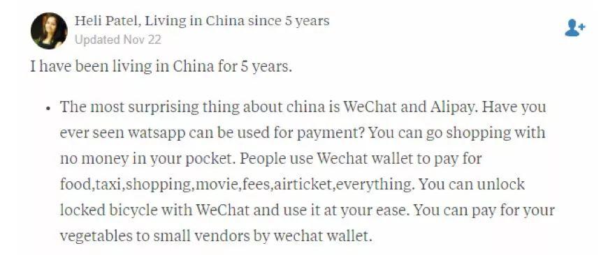 在中国生活居住了5年之久的印度网友Heli Patel说:“中国最让我感到惊讶的地方是微信和支付宝。你见过可以支付的聊天软件吗?你可以在你口袋里没有钱的时候去购物,人们使用微信钱包来购买食物、打出租车、购物、电影、机票、一切。你还可以使用微信解锁(共享)单车,你还可以使用微信向小商贩为你的蔬菜付钱。”