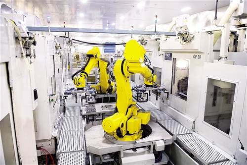 1月16日,机器人在瑞安市瑞明集团智能化托盘线上搬运物料。该生产线上,1个工人可操纵4台机器人,轻松完成相当于以前30个工人的工作。新华社记者 翁忻旸摄