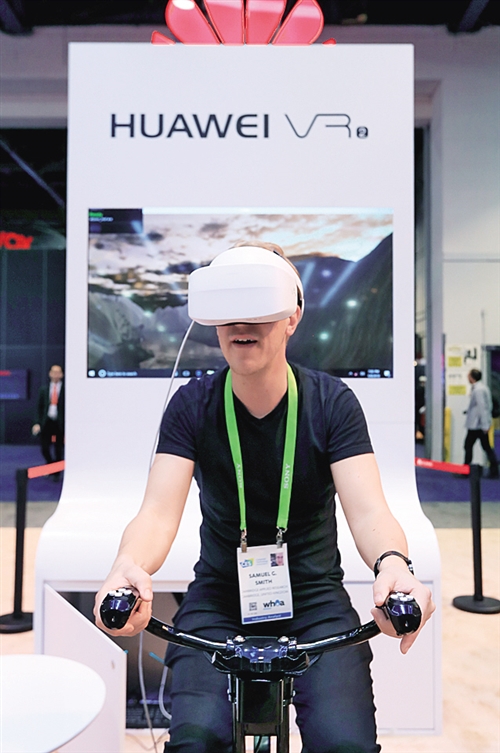 1月10日,在美国拉斯韦加斯,一名男子在消费电子展上体验华为公司的虚拟现实设备。新华社记者 李颖摄