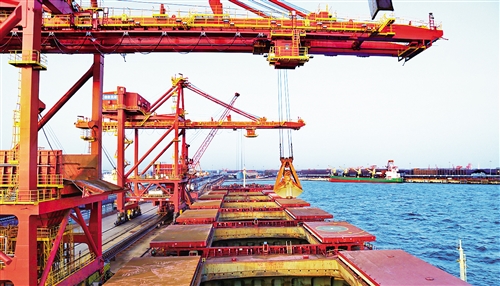 一艘轮船靠泊在秦皇岛港矿石码头卸载。
