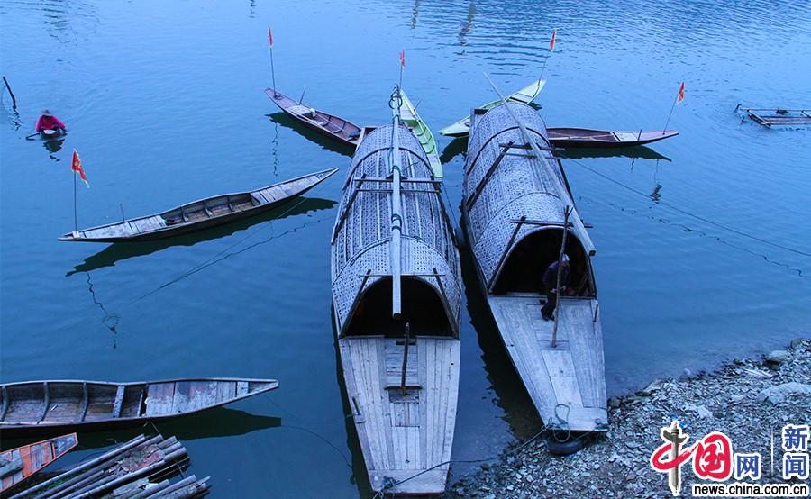 2018年1月19日,安徽省黄山市歙县的“新安江山水画廊”,江面上停泊着渔船,一位村民划向岸边。中国网记者董小迪 摄