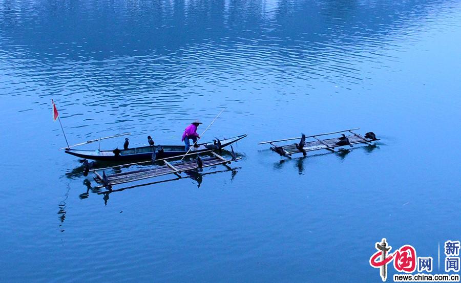 2018年1月19日,安徽省黄山市歙县的“新安江山水画廊”,村民与鱼鹰。中国网记者董小迪 摄