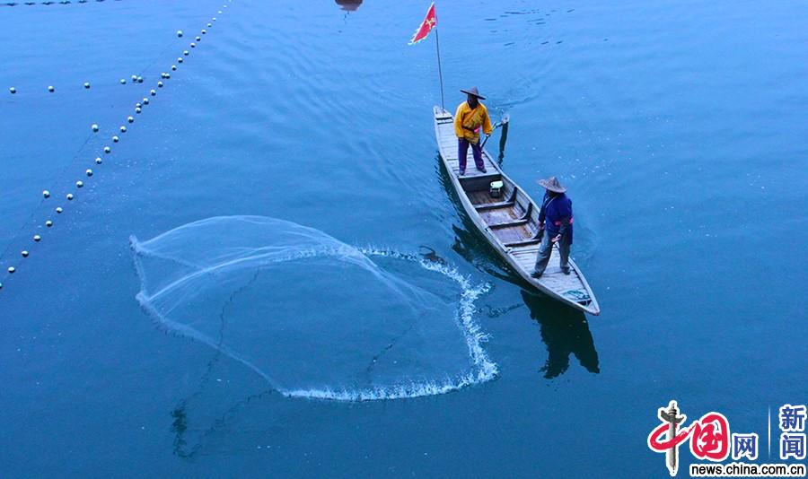 2018年1月19日,安徽省黄山市歙县的“新安江山水画廊”,村民表演撒网捕鱼。中国网记者董小迪 摄