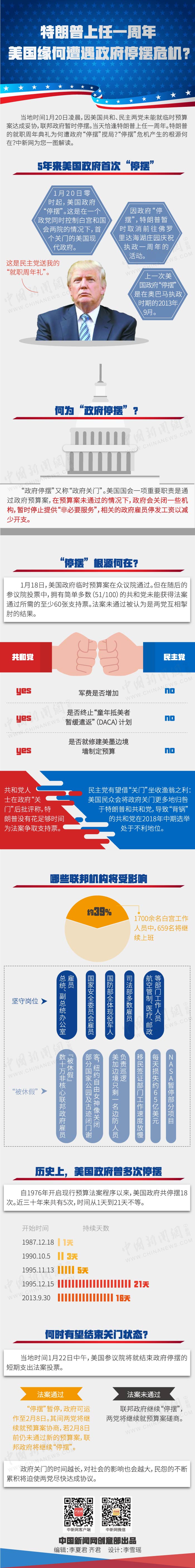 中新网1月23日电当地时间1月22日,美国参议院投票通过临时支出法案,已“关门”两天多的美国联邦政府将“重开”,并得以维持运转至2月8日。在美国总统特朗普就职一周年之际,美国联邦政府为何“停摆”?未来是否还会发生类似情况?中新网为您一图解读。