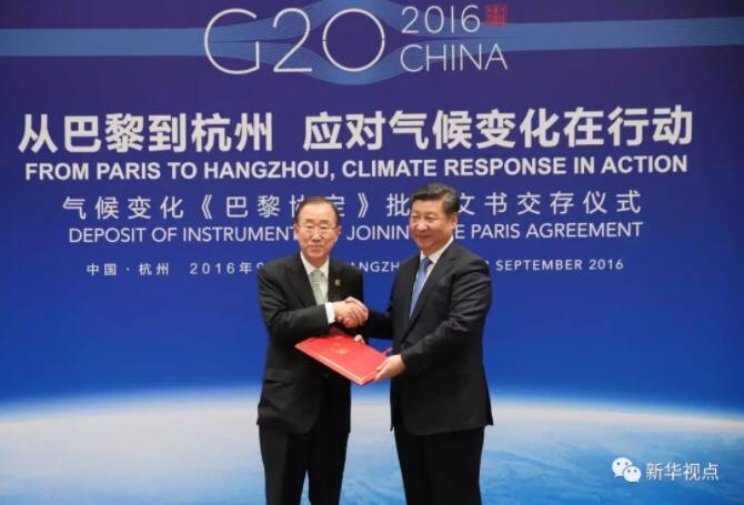 2016年9月3日,习近平向潘基文交存中国气候变化《巴黎协定》批准文书。新华社记者兰红光摄