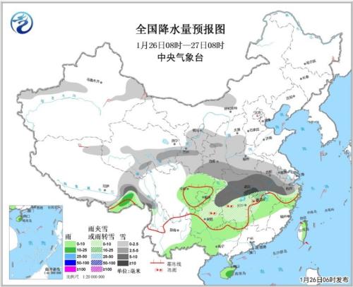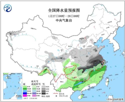 26日08时至27日08时,鄂皖浙等地有大雪,湘黔赣部分地区有冻雨。青海东南部、西藏东南部、西北地区东南部、江淮、江汉、江南西部和北部等地有小到中雪或雨夹雪,其中,湖北东部和南部、安徽西南部、浙江西北部、江西北部、湖南北部、重庆东南部等地的部分地区有大雪,湖北东南部的部分地区有暴雪(10~13毫米),此外,湖南中北部、贵州中东部、江西西北部有冻雨;西南地区东部、江南东南部、广西等地有小到中雨。山东半岛等地有4~6级风。台湾海峡、南海东北部有8级、阵风9级的大风。