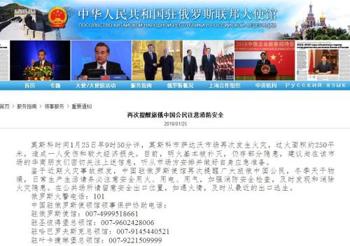 鉴于近期火灾事故频发,中国驻俄罗斯使馆再次提醒广大旅俄中国公民,冬季天干物燥,日常生产生活请务必注意安全用火、用电、用气,加强消防安全检查,及时发现和消除火灾隐患。在公共场所请留意安全出口位置,如遇火情,及时从最近的出口逃生。