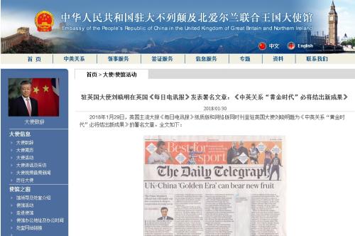 1月29日,驻英国大使刘晓明在《每日电讯报》发表文章,评论中英关系。图片来源:中国驻英国大使馆网站截图。