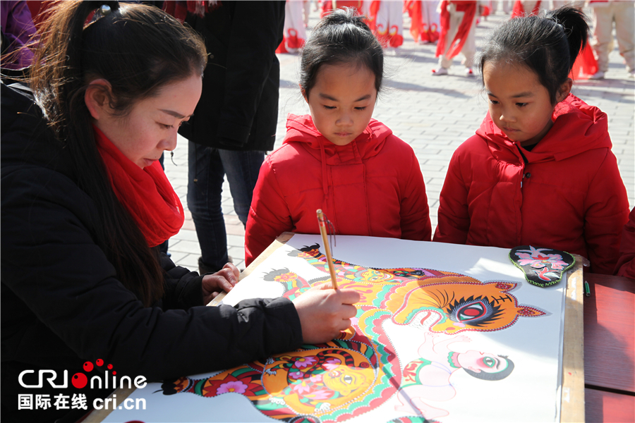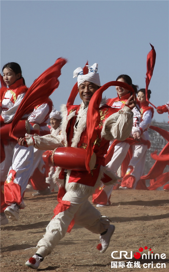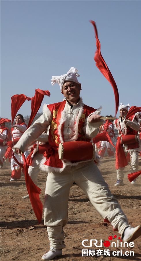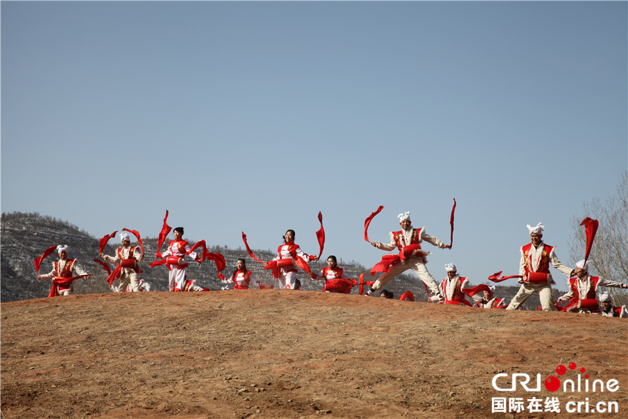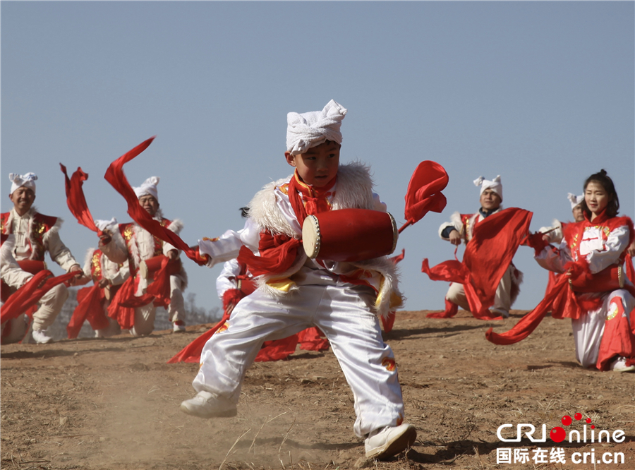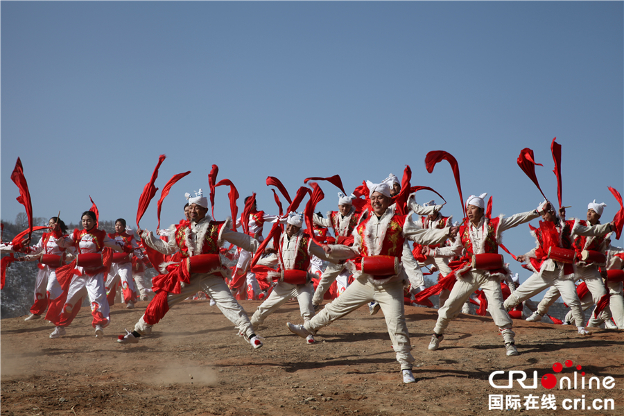 1月17日,记者在延安市安塞区冯家营民俗文化村看到,伴随着雄浑的锣鼓点和高亢的唢呐声,人群对面的黄土坡上现出一些腰鼓艺人,先是3、4个,接着便如红白两色的瀑布般沿山坡坡面倾斜而下,顷刻填满整个山坡。他们敲打着腰鼓又蹦又跳,鼓槌上的红丝带被挥舞得上下翻飞,展现的是村里人庆丰收,迎佳节的喜庆场面。其间,一名6岁男孩还被大人们簇拥着独舞了一段,赢得了如雷般的掌声。