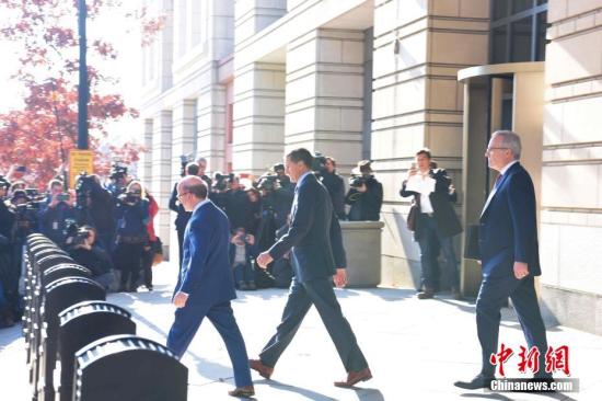 当地时间12月1日,美国总统特朗普前国家安全事务助理迈克尔·弗林(中)在华盛顿出庭并认罪,其罪名是在涉俄调查中向美国联邦调查局(FBI)作伪证。中新社记者 刁海洋 摄