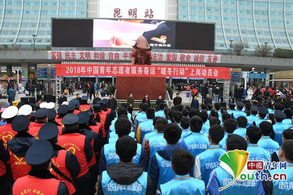 2月1日上午,2018年中国青年志愿者服务春运“暖冬行动”上岗动员会在云南昆明火车站举行。来自铁路、公路、机场等系统的200余名春运青年志愿者,现场观摩演练昆明铁路局集团公司团委结合《中国青年志愿者服务春运“暖冬行动”培训指导手册》细化的志愿服务管理“三四五”工作法和志愿服务“七字诀”。团中央书记处书记尹冬梅、青年志愿者行动指导中心党委书记刘剑波以及全国铁道团委、云南团省委、中国铁路昆明局集团有限公司负责同志现场慰问春运志愿者,并到重点旅客候车室开展志愿服务。