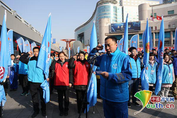 图为2018年北京市“暖冬行动”春运志愿服务启动暨春运志愿服务日活动现场,志愿者代表在现场宣誓。中国青年网记者 宋晨 摄