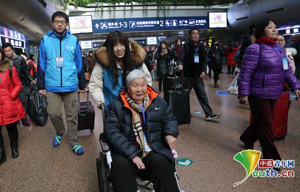 图为北京西站“暖冬行动”春运服务志愿者为旅客提供服务。中国青年网记者 宋晨 摄