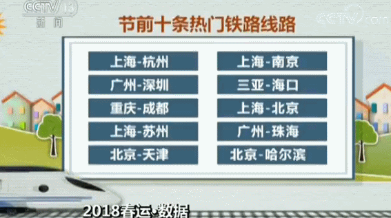 根据火车票预售数据,节前十条热门铁路线路为:上海-杭州、广州-深圳、重庆-成都、上海-苏州、北京-天津、上海-南京、三亚-海口、上海-北京、广州-珠海、北京-哈尔滨。这些热门线路中,高铁出行需求快速增长。