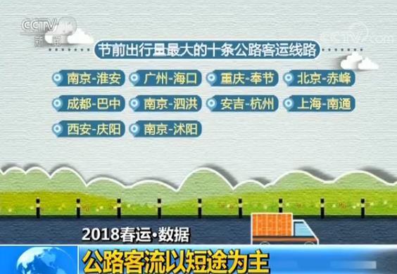 公路方面,客流以短途为主。节前出行量最大的十条公路客运线路为:南京-淮安、广州-海口、重庆-奉节、北京-赤峰、成都-巴中、南京-泗洪、安吉-杭州、上海-南通、西安-庆阳、南京-沭阳,以省内或往邻省的短途出行线路为主。热点公路客运站对城市交通接驳集散服务需求较为突出。