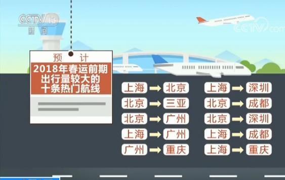 根据机票预售数据,预计今年春运前期出行量较大的十条热门航线为:上海-北京、上海-深圳、北京-三亚、北京-成都、北京-广州、北京-深圳、上海-广州、上海-成都、广州-重庆、上海-重庆。