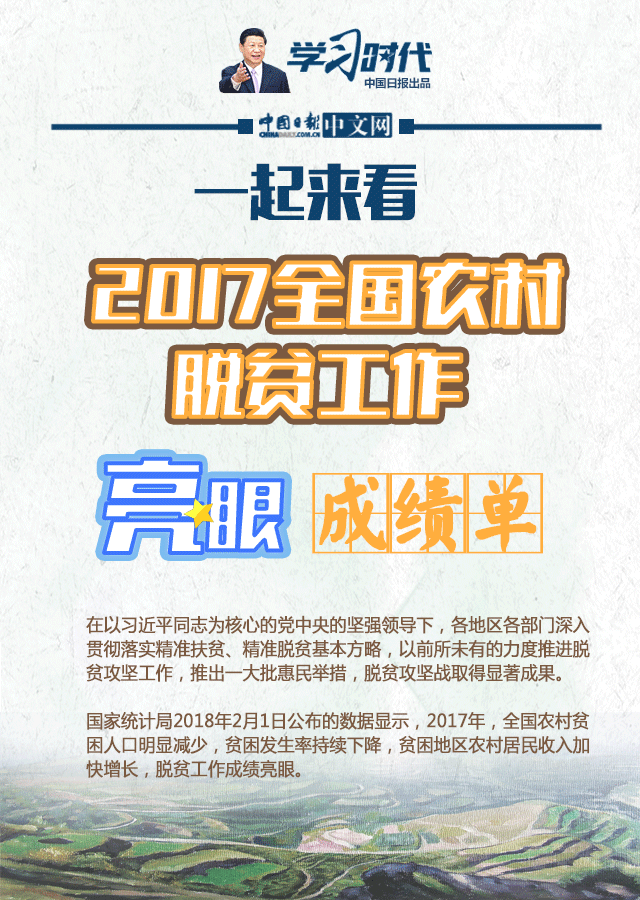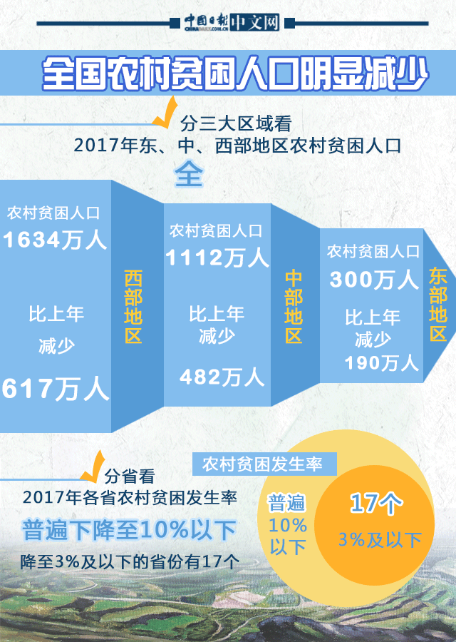 国家统计局2018年2月1日公布的数据显示,2017年,全国农村贫困人口明显减少,贫困发生率持续下降,贫困地区农村居民收入加快增长,脱贫工作成绩亮眼。