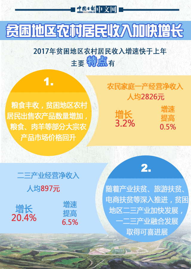 2017年贫困地区农村居民收入增速快于上年。其主要特点:一是粮食丰收,贫困地区农村居民出售农产品数量增加,粮食、肉羊等部分大宗农产品市场价格回升。二是随着产业扶贫、旅游扶贫、电商扶贫等深入推进,贫困地区二三产业加快发展,一二三产业融合发展取得可喜进展。