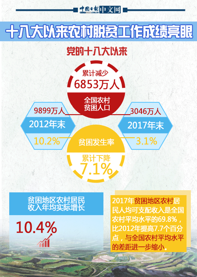 截至2017年末,全国农村贫困人口从2012年末的9899万人减少至3046万人,累计减少6853万人;贫困发生率从2012年末的10.2%下降至3.1%,累计下降7.1个百分点。