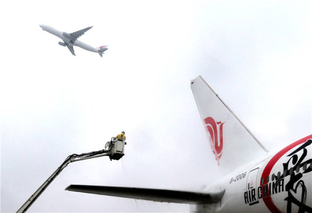 1月25日,上海虹桥机场的地勤人员为大型客机除冰雪,减少航空器滞留时间。新华社记者陈飞摄