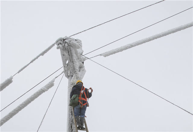 1月8日,电力工人在湖南省张家界市桑植县南滩村一处线路故障点除冰。新华社记者王天聪摄